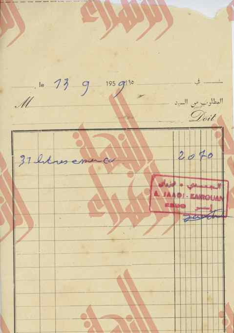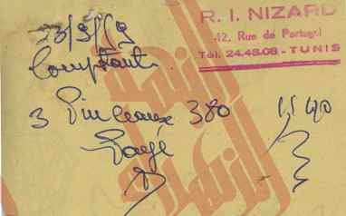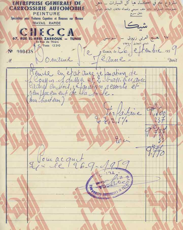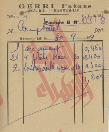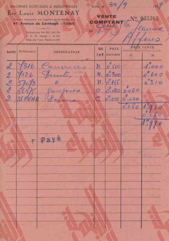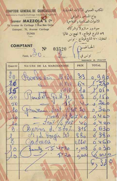 02-201 : فواتير ووصولات خاصة بإدارة البارون ديرلانجي – 1959/1953 18 مايو 202118 مايو 2021 • Mohamed Anis Hmadi قوائم في مشتريات مختلفة.وصولات خلاص.فواتير.بطاقات زيارة. [Montrer sous forme de vignettes]